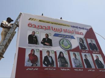 Dựng pa-nô dán các bích chương tranh cử tại Benghazi ngày 04/07/2012.