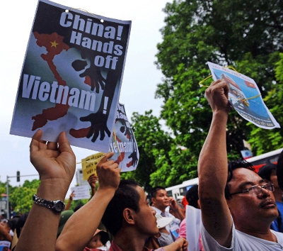 Hàng trăm người dân ở Hà Nội biểu tình chống Trung Quốc ngày 8 tháng 7, 2012 khi hay tin Công ty Dầu khí Hải Dương CNOOC gọi thầu quốc tế 9 lô tại thềm lục địa và đặc quyền kinh tế của Việt Nam. (Hình: Hoang Dinh Nam/AFP/GettyImages)