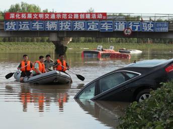 Một xuồng cứu hộ đang áp sát một chiếc xe bị ngập trên xa lộ tại Bắc Kinh, ngày 22/07/2012.