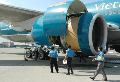 Nhân viên Bộ Giao Thông Nhật kiểm tra động cơ phản lực chiếc Boeing 777 của Vietnam Airlines sau khi phát ra lửa lúc đáp xuống phi trường Narita ở Chiba hồi năm 2008. (Hình: STR/AFP/Getty Images)