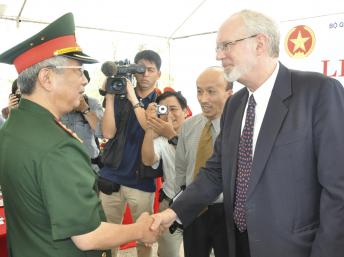 Thứ trưởng Quốc Phòng Việt Nam Nguyễn Chí Vịnh (trái) bắt tay đại sứ Hoa Kỳ David Shear tại lễ khởi công dự án làm sạch chất độc Da cam tại Đà Nẵng, 09/08/2012.